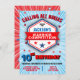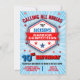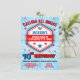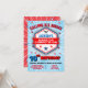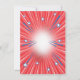 Poster style Ninja Warrior birthday party invitation with shield, stars, sunburst background and red, white and blue colors.
