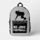 Lightweight and durable, our Retro No Joke Football Linewoman Backpack is just what you need. The spacious interior is ideal for travel, film sessions, gym, or any mobile storage need. Bring your stuff with you in style! Features Adjustable padded shoulder straps, two chambers on the inside for laptop storage, mesh side pockets and an identification label. This backpack is as tough and rugged as an offensive line shield.