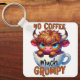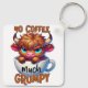 A funny and sarcastic colourful design showcases an adorable highland cow perched in an empty coffee cup. With a grumpy expression, big blue eyes, and brown fur, the cow adds a charming touch. The vibrant text reads, "No coffee much grumpy." This design is featured on a variety of products, making it a perfect gift for coffee enthusiasts.