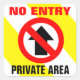 Entry not allowed private area sign stickers. Square no entry sign icon with a black arrow up with a red diagonal not allowed stripe and round border sticker with fully customisable red text "No entry" and black text "Private area" against diagonal yellow white warning stripes square small sticker sheet. This ahead/ entry prohibited warning product is fully customisable, add your personal texts and image. A great no entry warning for your working space door or cubicle or garage door at home.