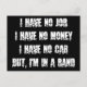 I have no job, I have no money, I have no car, BUT - I'm in a band. Black & White. Printed on t-shirts, hoodies, stickers, party supplies, collectibles and more.