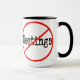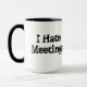 No Meetings sarcastic office humour slogan in distorted letters with a red circle and a line. The other side reads I Hate Meetings in a grungy typewriter font. Don't get trapped in a meeting at work, show them how you really feel with this funny saying. Click Customise It to change fonts, text sizing and more!