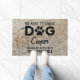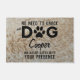 This design in black typography reads "No need to knock. Our dog has already alerted us to your presence" with room for your doggo's name. The "O" in Dog is a stylised paw print. The background is fur textured print.