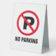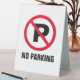 No parking forbidden to park letter P reversible Table Tent Sign. Custom warning signs for shops, museums, business, office, workplace,busy school, store, hotel, entry, entrance spot, door, hospital and other high traffic areas. Make your own forbidden to park your car signage with red prohibited circle and cross symbol. Handy for instructing customers, clients, visitors, guests, kids, drivers, trucks, bikers, cyclists, tourists etc. Also handy for other situations.
