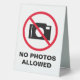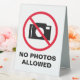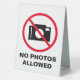 No photos allowed camera prohibited warning Table Tent Sign . Handy modern stop icon for museum, private property, library, shop, store, quiet no talking area, room, park, school exams, office, wedding, party, business, company, hospital, university, care home, zoo, shop, store, public space etc. Camera forbidden to use notice. Stop taking pictures (with flash). Reversible display.