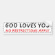 Simple text reads God Loves You; No Restrictions Apply. We know He does! Black and red text on white, grey dashed border.