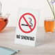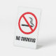 No smoking window pedestal sign featuring a black cigarette with smoke coming out and a red, crossed over circle around it. Below is customizable, black text "no smoking".