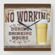 A vintage look poster featuring a foamy glass of beer and says " No working during drinking hours". An entertaining, fun poster.