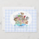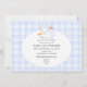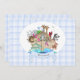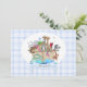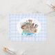 Noah's Ark full of animals with blue banner that reads "Baby's on the way!" on a blue gingham background. Reverse is a stork carrying a blue bundle. Perfect for Baby Shower for boy, Baby Announcement, Christening or Baptism.