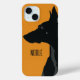 A minimalist iPhone case design for dog owners or lovers which has been put on yellow background. The design introduces a silhouette of a black Doberman accompanied with the default customisable thanks.