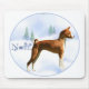 Noel. Evergreens, a snowy background, and the Basenji wish you a peaceful holiday season this Christmas. Our dog design makes a great gift for you or a friend.