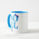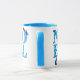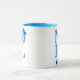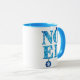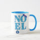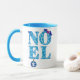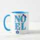 Mug in the greeting "Noel" patterned with retro modern Christmas trees in shades of ice blue, embellished with a holly sprig and a snowflake ornament