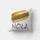 Decorative throw pillow features an original marker illustration of a shrimp po'boy sandwich, with NOLA in a fun font. A Louisiana foodie classic!