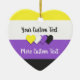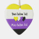 Ceramic Christmas ornament shaped like a heart with the lipstick non-binary pride flag with little hearts in the centre of the design. Yellow, white, purple, and black flag of the enby pride movement; with an editable text field for your name or message; a great way to decorate your Christmas tree :D