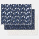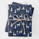 Set of three beautifully illustrated festive Nordic woodland gift wrap sheets perfect for wrapping your winter holiday and Christmas presents. These whimsical patterns feature Christmas trees, snowflakes, golden stars, and deer in dark blue, cobalt blue, and white colours. Original artwork by Marketa Stengl.