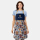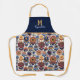 The bottom portion of this unique apron features a pattern of boho style flowers in tones of blue, cinnamon brown, and gold. The pattern is placed on a white background. The top portion is solid matching dark blue, with your monogram in gold and your name in light blue.