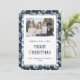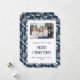 Magical blue photo Merry Christmas card featuring enchanted forest with a fox, folk botanicals and Nordic ornaments. Easily personalise this blue photo holiday card with your photo and family name.
