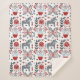 This attractive sherpa blanket has a beautiful and intricate Nordic or Scandinavian pattern in blue grey, red, and white. Images include floral designs, a decorated pony, hearts and line drawings. Unique and very pretty!