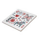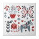 This attractive ceramic tile has a beautiful and intricate Nordic or Scandinavian pattern in blue grey, red, and white. Images include floral designs, a decorated pony, hearts and line drawings. Very pretty, especially pieced together as a border wall decoration.