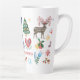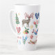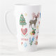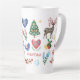 Here is a pretty Christmas theme latte mug that is covered with scandinavian style images, including a reindeer, pattern hearts, a Holiday tree, flowers, snowflakes, and more. Colours include red, green, gold, blue and brown. Everything is placed on a white background. Unique, colourful, and festive!