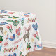 This festive Christmas theme table cloth is covered with scandinavian style images, including a reindeer, pattern hearts, a Holiday tree, flowers, snowflakes, and more. Colours include red, green, gold, blue and brown. Everything is placed on a white background. Unique and colourful!