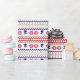 The repeated pattern on this colorful Christmas Nordic sweater style gift wrapping paper is a silhouette downhill snow skier among snowflakes , trees, and geometric designs. Colors include navy blue, bright Holiday green, and red, all on a white background. Fun for anyone who loves to snow ski!