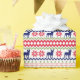 The repeated pattern on this colorful Christmas Nordic sweater style gift wrapping paper is a silhouette French Bulldog among snowflakes, trees, and geometric designs. Colors include navy blue, bright Holiday green, and red, all on a white background.