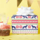 The repeated pattern on this colorful Christmas Nordic sweater style gift wrapping paper is a silhouette German Shepherd Dog among snowflakes, trees, and geometric designs. Colors include navy blue, bright Holiday green, and red, all on a white background.