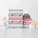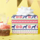 The repeated pattern on this colorful Christmas Nordic sweater style gift wrapping paper is a silhouette Giant Schnauzer Dog among snowflakes, trees, and geometric designs. Colors include navy blue, bright Holiday green, and red, all on a white background.