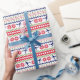 The repeated pattern on this colorful Christmas Nordic sweater style gift wrapping paper is a silhouette ice skater among snowflakes , trees, and geometric designs. Colors include navy blue, bright Holiday green, and red, all on a white background. Fun for anyone who loves to ice skate!