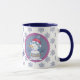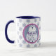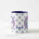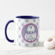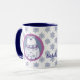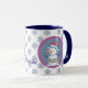 Here's a cute personalised Christmas mug that both children and adults can enjoy. One side features an adorable nordic style snowman image at the centre of a blue grey background that is framed in matching lavender pink. The other side has polar bear on the same circle banner. The framed images are then placed on a matching blue and white snowflake background, with your custom text in navy blue between the images.