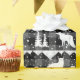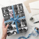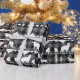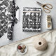 An elegant neutral holiday wrapping paper featuring a Nordic sweater winter animal pattern in grey and black buffalo plaid, with a white winter animals.
