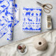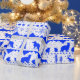 A neutral and bright coloured holiday wrapping paper featuring a white and royal blue Nordic sweater pattern of winter animals like the arctic fox, the stag reindeer and a polar bear family.