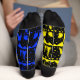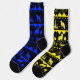 Nordic Sweater pattern of bright yellow on one sock and deep purple blue on the other sock of silhouettes of winter animals on black featuring a polar bear family, the stag deer and the arctic fox.