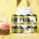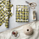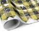 An elegant neutral holiday wrapping paper featuring a Nordic sweater winter animal pattern in white on a mellow yellow and black buffalo plaid background.