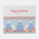 Modern design for the holiday season features centred large border of Nordic mountains and trees on light grey background. Customisable "Happy Holidays" top text