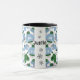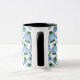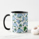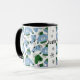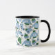 Winter theme coffee mug with a cute Nordic style pattern of thick sweaters, hats, mittens, socks and Scandinavian snowflakes in shades of blue with green accents. Personalise the name in the easy Zazzle "Personalise" button.