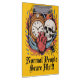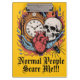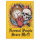 Celebrate your unique, beautifully weird side with this striking gothic illustration. A skeletal skull, realistic heart, and ornate clock are wrapped in flames, framed by bold gothic typography that reads “Normal People Scare Me!!!”