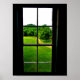 An image of the green land around the Norwegian homestead, Norskadalen, from inside a historic home.