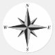 White sticker with grey and black compass symbol.