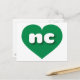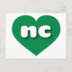 This postcard features a vibrant green heart containing the bold, rounded, white lower case letters nc, a playful version of the abbreviation for North Carolina, the tar heel state. The reverse side of the postcard is blank, awaiting your handwritten sentiments or customised text.