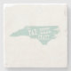 The silhouette outline map shape of the old north state filled in with a light green background and the states nickname Tar Heel State cut out to reveal the marble making up this coaster.