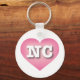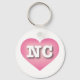This keychain features a calm, cool, and collected pink heart with a white-washed centre containing the bold, white, upper case letters NC, the official abbreviation for North Carolina, the tar heel state.