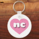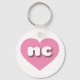 This keychain features a vibrant pink heart containing the bold white, rounded lower case letters nc, a playful version of the abbreviation for North Carolina, the Tar Heel State.