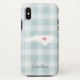 Show some home state pride with this cute rustic style phone case featuring a white silhouette map of the state of North Carolina with a pink heart inside, on a hand drawn buffalo plaid background in pastel mint green and white. Add a name, monogram or phrase at the bottom in handwritten script lettering. You can even change the position of the heart to your home city by opening the design tool and dragging the heart shape to your favourite spot!