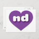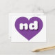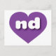 This postcard features a vibrant purple heart containing the bold, white, rounded lower case letters nd, a playful abbreviation for North Dakota, the peace garden state. The reverse side of the card is blank, awaiting your personalised text or handwritten sentiments.