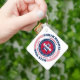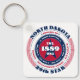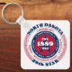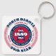 The North Dakota State Keychain has a circular typography design with red, white, and blue colours on a white background. The text includes the state's name, capital, state abbreviation, resident's name, region, time zone, geographic coordinates, the year of its statehood, and the country - The United States of America. Unique patriotic gift idea.