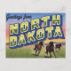 Discover the spirit of the Roughrider State with this classic retro "Greetings from North Dakota" postcard. The vintage large-letter design features an exciting scene of wild horses galloping across the prairie under a colorful sunset sky. This art captures the rugged beauty and expansive plains of North Dakota. It's a fantastic souvenir for residents, nature lovers, Western enthusiasts, collectors of Americana, or anyone who appreciates US state travel art. Send a piece of nostalgia or display it as framed art.