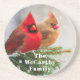 Beautiful northern cardinals sit in a pine tree on a snowy winter background on these custom ceramic coasters that you can personalise with your family name or a seasonal phrase. They are perfect not only for the holidays, but also they can continue to serve you throughout the winter months!
