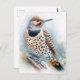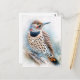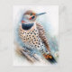 This postcard features watercolor artwork of a Northern Flicker, a striking species of woodpecker, perched on a branch. The bird's intricate plumage features warm earthy tones, bold black spots, and vibrant red markings near its face, creating a captivating contrast. Soft, misty brushstrokes blend into the background, adding a dreamy, ethereal quality. Delicate floral elements and subtle details enhance the natural elegance of this piece, making it perfect for bird lovers, and those who appreciate fine wildlife art.
